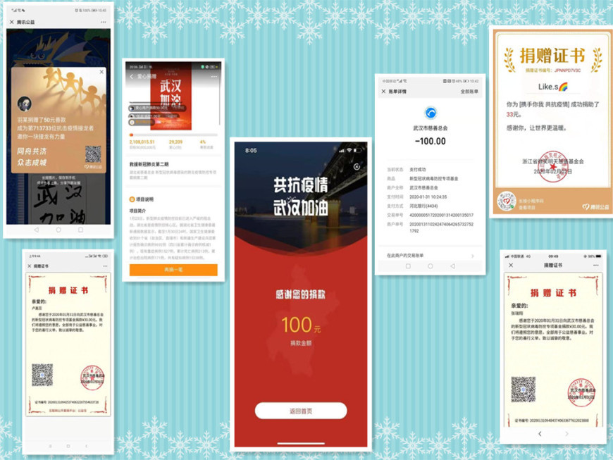 通过“腾讯公益”、“快手公益”、“中国绿发会”等捐款:梁婧爽、胡晶磊、董一凡等同学;