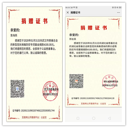 通过“红十字会”及其他捐助平台等捐款:温倩伟、张羽莹、.张耀月等同学;
