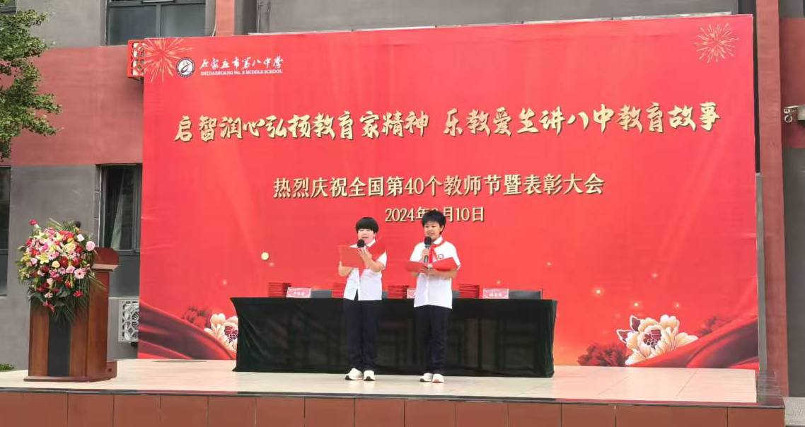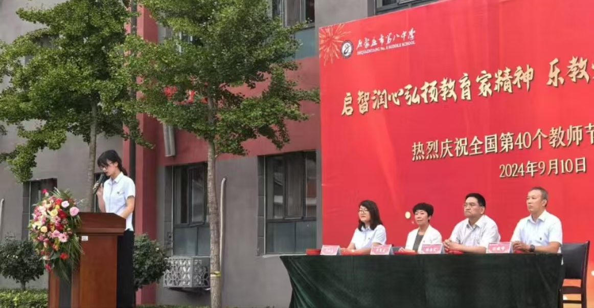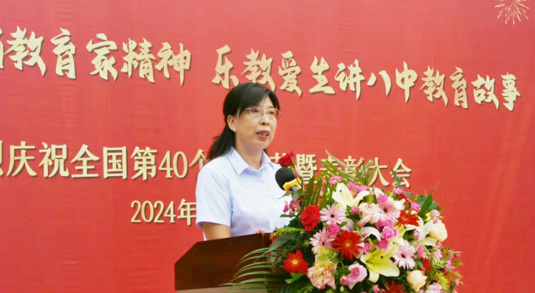 杏坛芳菲添新绿,新光熠熠启新篇。在第 40 个教师节来临之际,为共兴尊师重教风尚,大力弘扬教育家精神,我校召开了以“启智润心弘扬教育家精神 乐教爱生共讲八中教育故事”为主题的教师节庆祝暨表彰大会,由办公室主任高松梅主持。