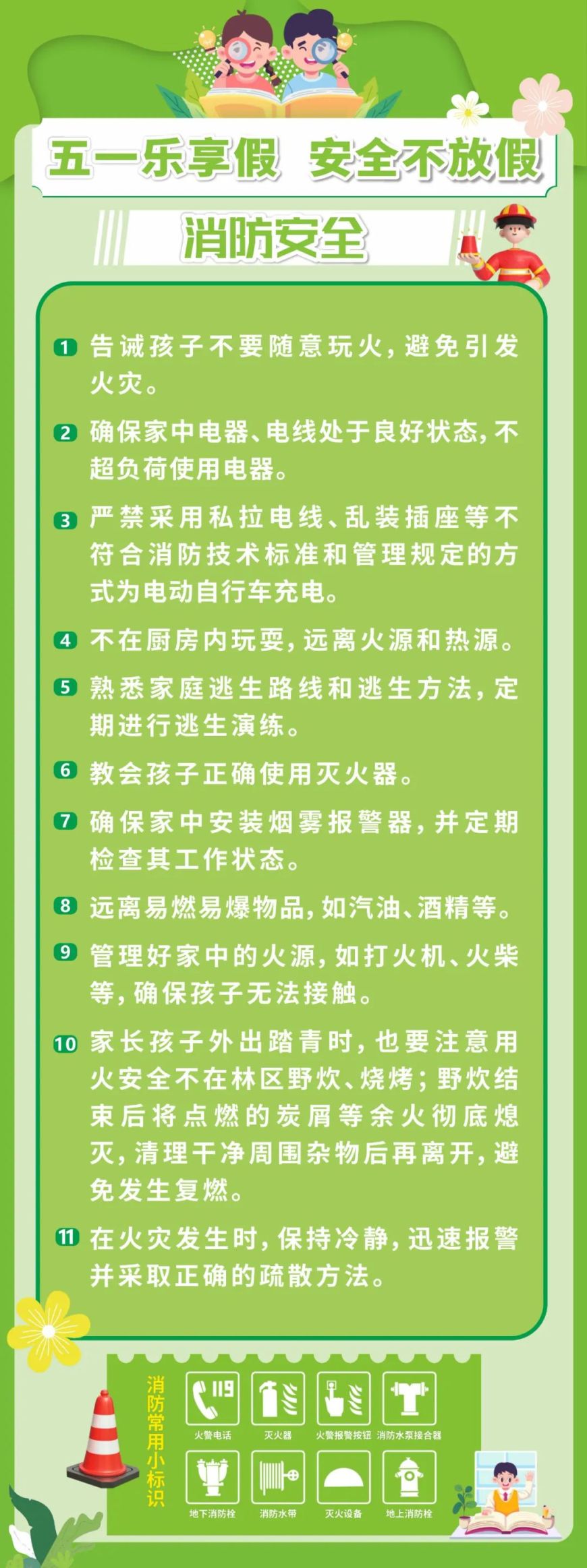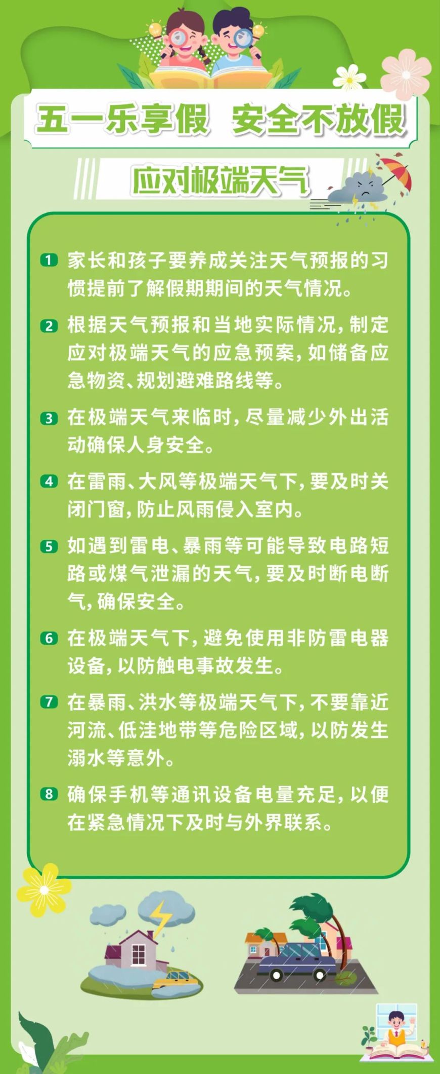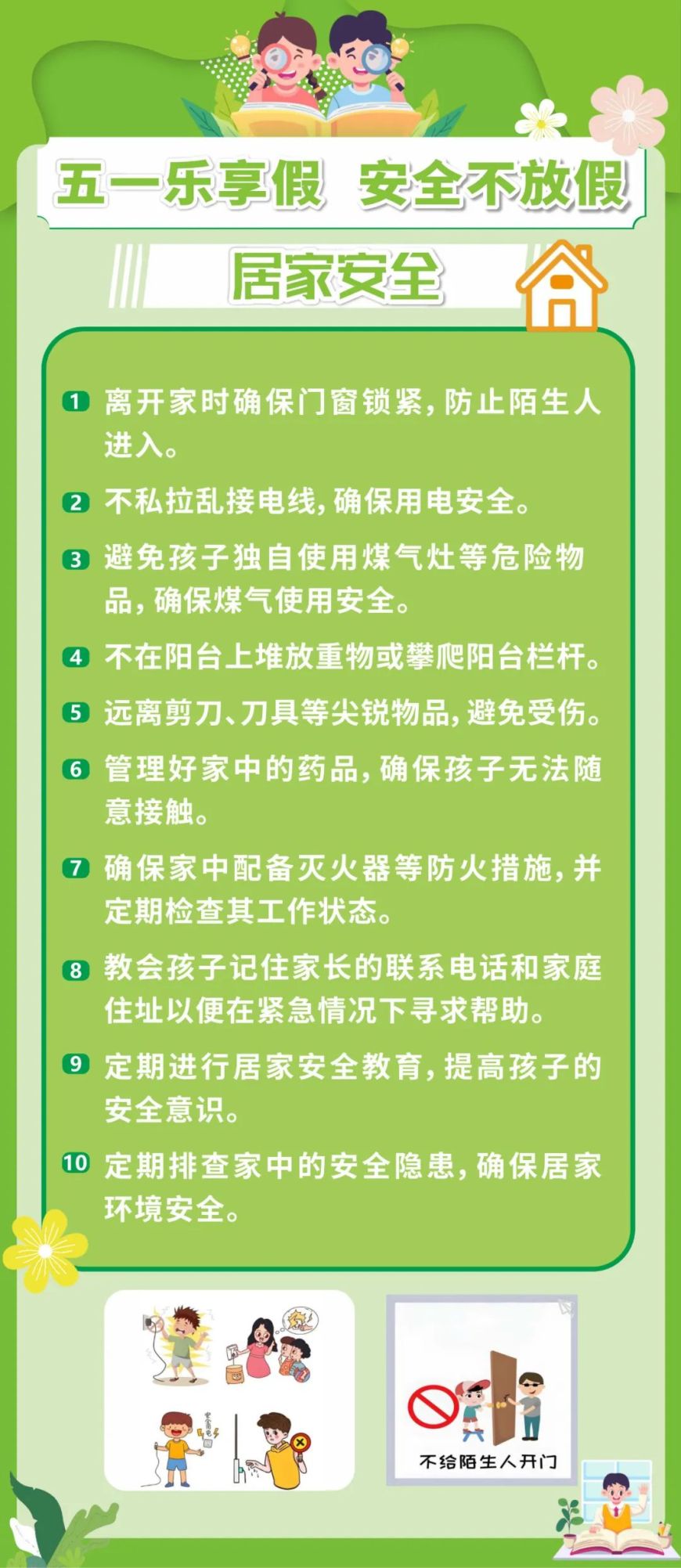 家长朋友们,孩子的安全离不开家庭的支持配合,您对孩子多一次安全教育,孩子就多一次安全保障。让我们共同努力,确保孩子度过健康、文明、安全的“五一”假期。