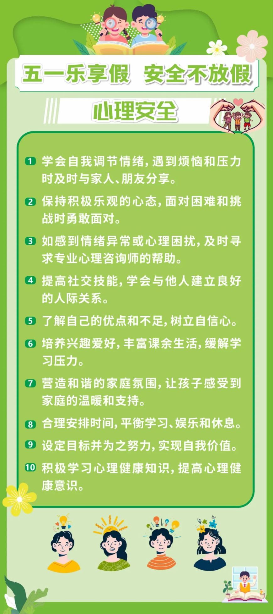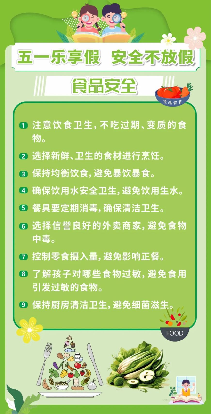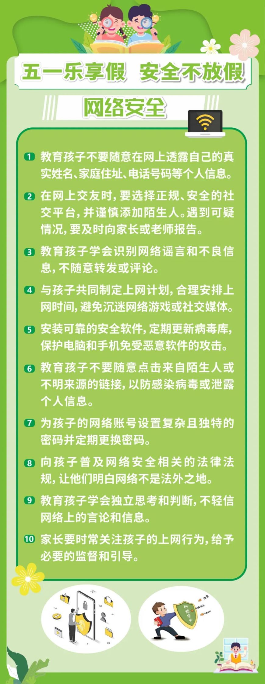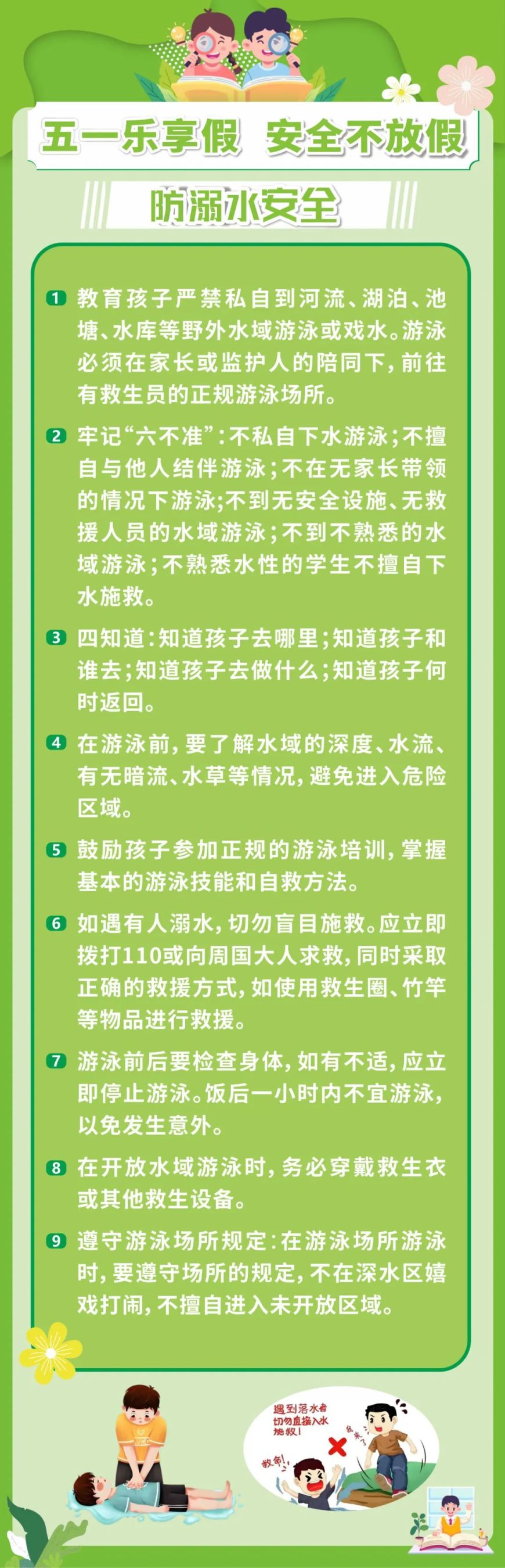 家长朋友们,孩子的安全离不开家庭的支持配合,您对孩子多一次安全教育,孩子就多一次安全保障。让我们共同努力,确保孩子度过健康、文明、安全的“五一”假期。