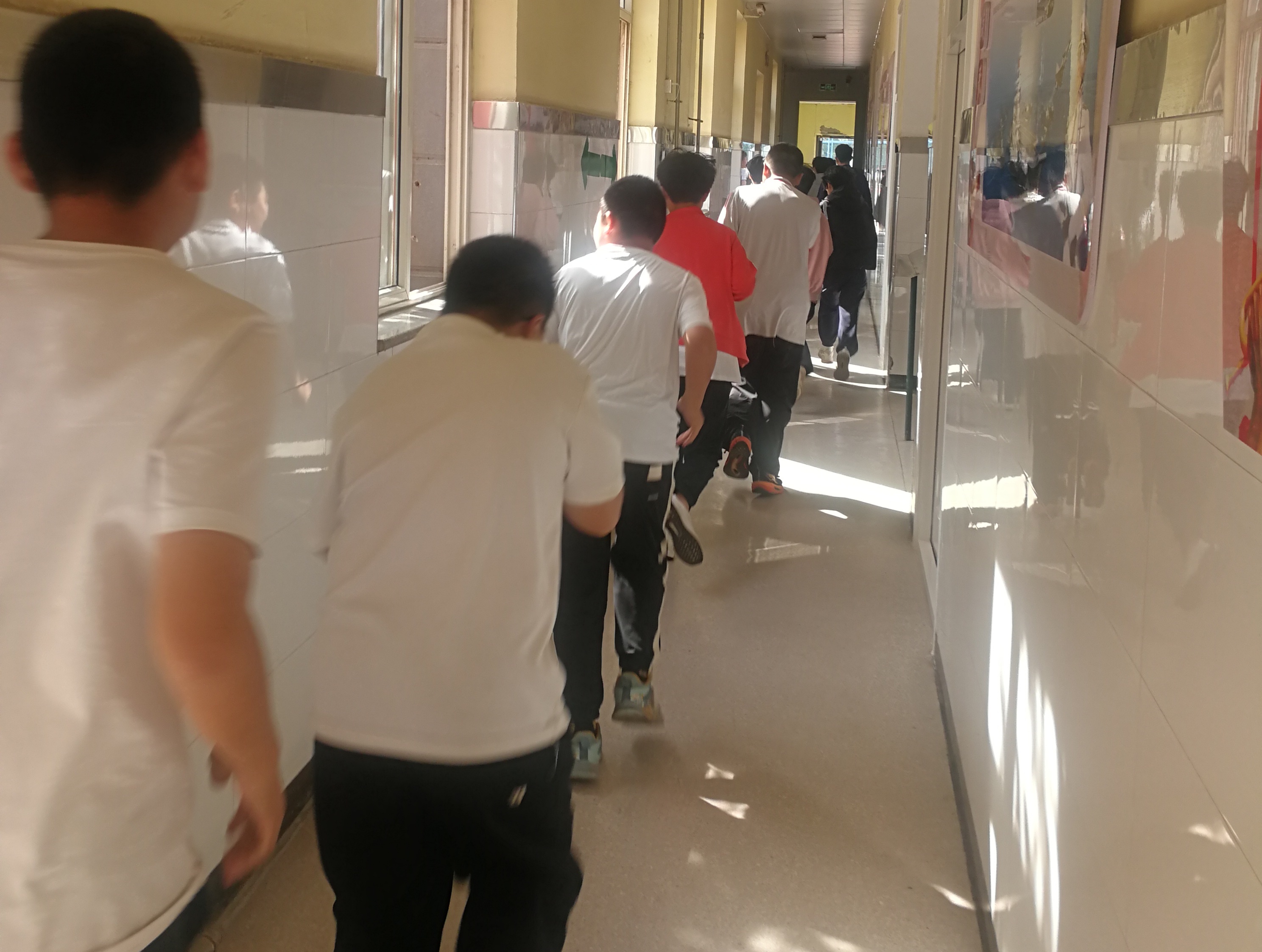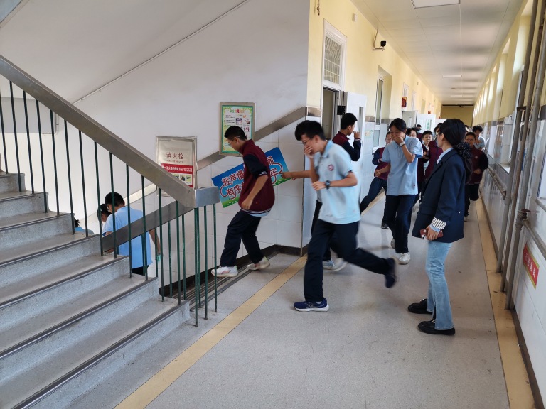 9 时55 分,应急警报准时响起,演练正式启动。各班学生在科任教师指引下,迅速进入“应急状态”。疏散过程中,学生保持弯腰姿势,沿墙壁或走廊一侧快速行进,下楼梯时自觉扶握扶手,无奔跑、推挤现象。途经关键节点时,在疏导教师的指引下有序避让,确保路线畅通;仅用数分钟,全体学生便顺利抵达操场指定集合区域。