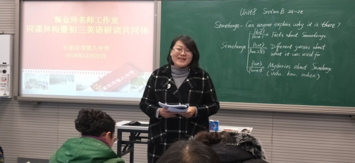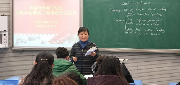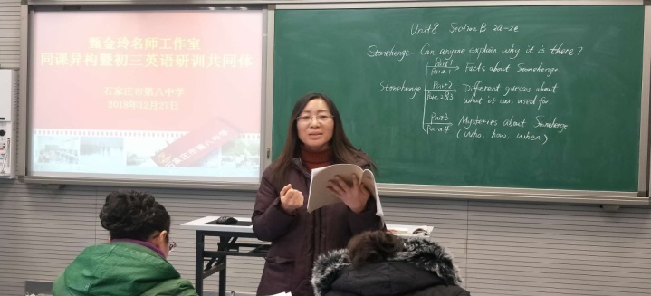 2018年12月27日,大雪纷飞,天寒地冻,石家庄市第八中学迎来了本学年甄金玲名师工作室的最后一次活动。来自石家庄市第八中学、第二十五中学、第四十九中学的老师们齐集一堂,共同参加了本次同课异构暨研训共同体活动。石家庄市第八中学吴香蕊和王素丽两位老师为大家呈现了两节风格迥异但精彩纷呈的英语课。